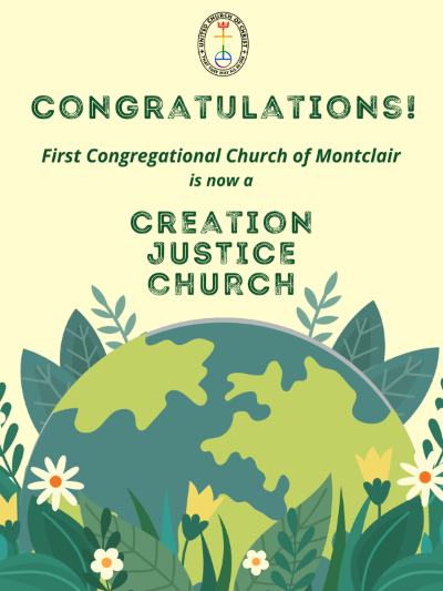 We, the members of First Congregational Church of Montclair, New Jersey, affirm that caring for creation is fundamental to our faith. We love our home, the earth, and we believe we are blessed with the responsibility of caring for the planet. We also believe this responsibility is inseparable from our relationship with God, each other, and all living things. In caring for the earth, we mean to create healthy and safe communities for our families and neighbors. Tending to these relationships fills us with joy and wisdom, and we are grateful for the abundance it brings.